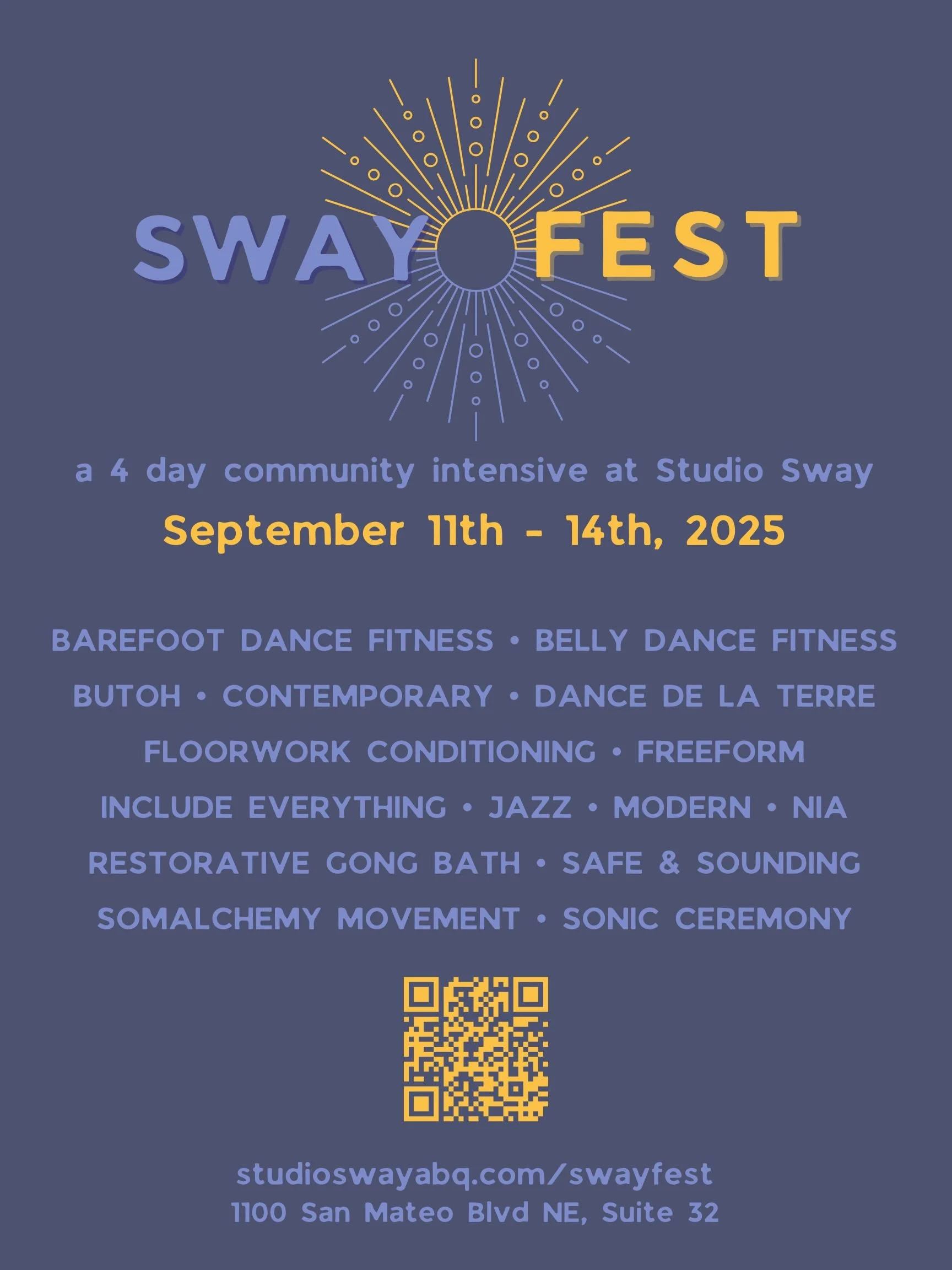 SwayFest 2025 Thursday, September 11, 2025 10:00 AM Sunday, September 14, 2025 6:00 PM Google Calendar ICS SwayFest is a 4-day community dance intensive and celebration of all things Studio Sway, offering a wide variety of classes, workshops and experiences for adult dancers of all levels. Learn more